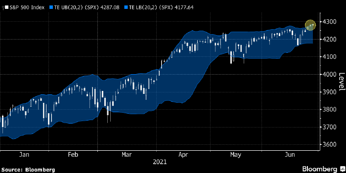 S&P 500 закрывается на рекордных уровнях уже три торговых сессии подряд и, учитывая текущую динамику фьючерсов, может сегодня сделать это и в четвертый раз. Однако рост индекса завел его в зону перекупленности, где формируются технические сигналы на продажу, отмечает аналитик Bloomberg Кеннет Секстон.